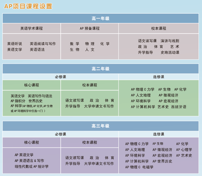 AP课程班的课程由基础课程和AP高级课程组成,学制三年。