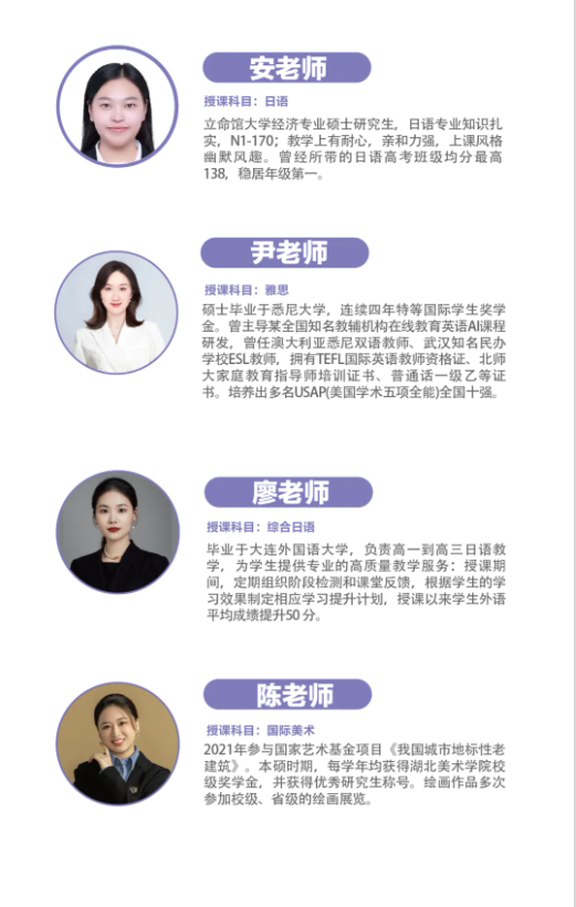 高一进行基础训练,高二开展进阶、定向训练,高三针对校考强化学习,全程日语强化提升,覆盖整个升学流程。家长无需委托中介,境内外一站式升学、跟踪体系,解除家长教育及升学焦虑。