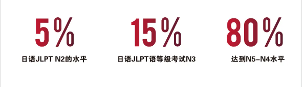 日本班于2023年9月正式成班,学生们从零基础入学,通过一年的日语学习,在2024年上半年,5% 的学生达到日语JLPTN2的水平,15%的学生达到日语JLPT语等级考试N3,80%的学生达到N5-N4水平。预计升入高三后,90%学生超越N2水平。