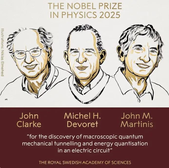 瑞典皇家科学院决定将2025年诺贝尔物理学奖授予约翰·克拉克、米歇尔·H·德沃雷和约翰·M·马蒂尼斯三名量子物理学家,以表彰他们在电路中实现宏观量子力学隧穿效应和能量量子化方面的贡献。
